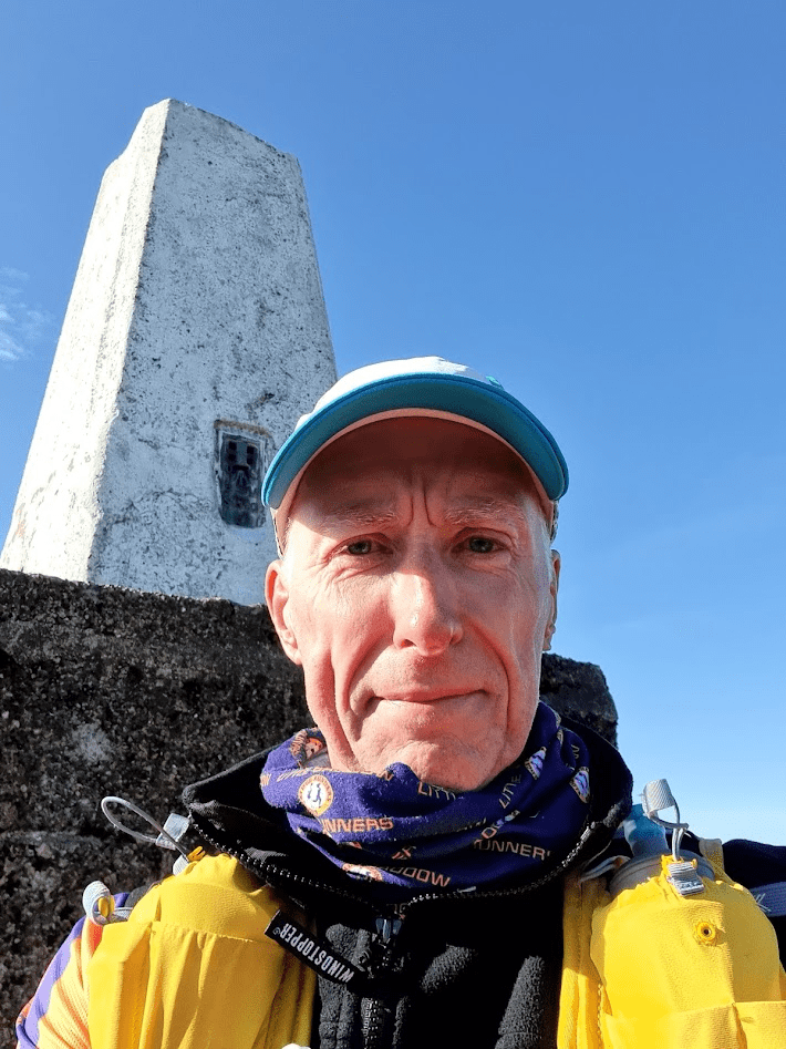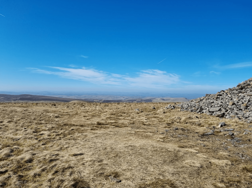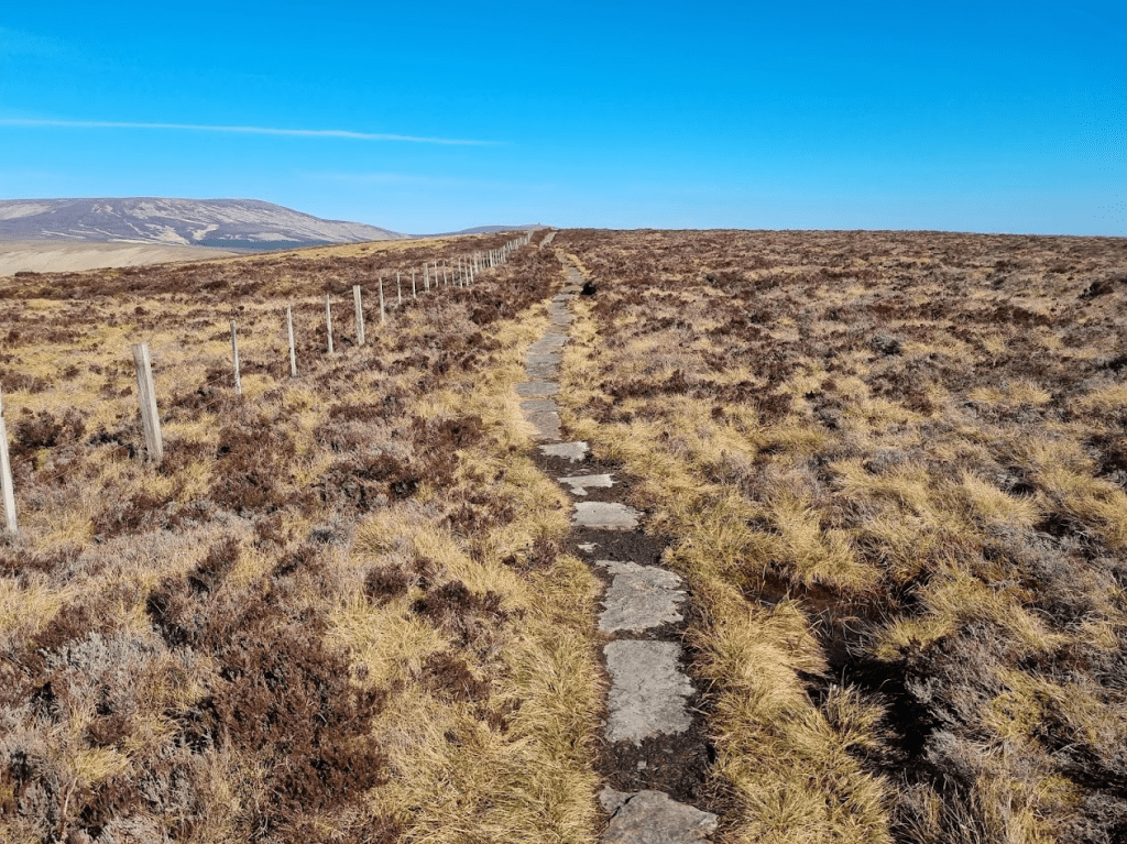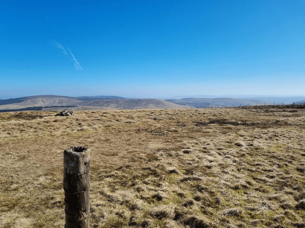 The next 5 miles would take me to the top of the Cheviot. Although that would be the highest point of the run, I wasn’t too worried. Firstly, the path was easy, mostly slabbed with a few rougher sections. Secondly there was actually only about 200 metres of climb from where I was to the top. Obviously being me I couldn’t make this totally straightforward and sure enough I learned a valuable lesson. There were various points on the Pennine Way where the slabs were either missing, leaving a bottomless bog, or just slightly submerged and safe to walk on. Within sight of the summit there was such an area. I very carefully probed with my walking pole to find the slightly submerged slabs. The valuable lesson is to put my foot in the same place as the pole found the slab, not a few inches to the left into a bottomless bog… I should confess this wasn’t my first major bog related error. At some point, I’m not sure where, I was going uphill through bog, wondering why so much water could stay uphill instead of doing the decent thing and running to the bottom. I was with two other runners at this point. At one particularly wet section my companions turned sharp right to go around it. We were following a fence line and I noticed a rail along the bottom of the fence I could kind of slide along over the wet bit. what I hadn’t noticed was that the wet bit extended further than the rail. I pulled myself out of the bog and my fellow runners were kind enough not to laugh too much.