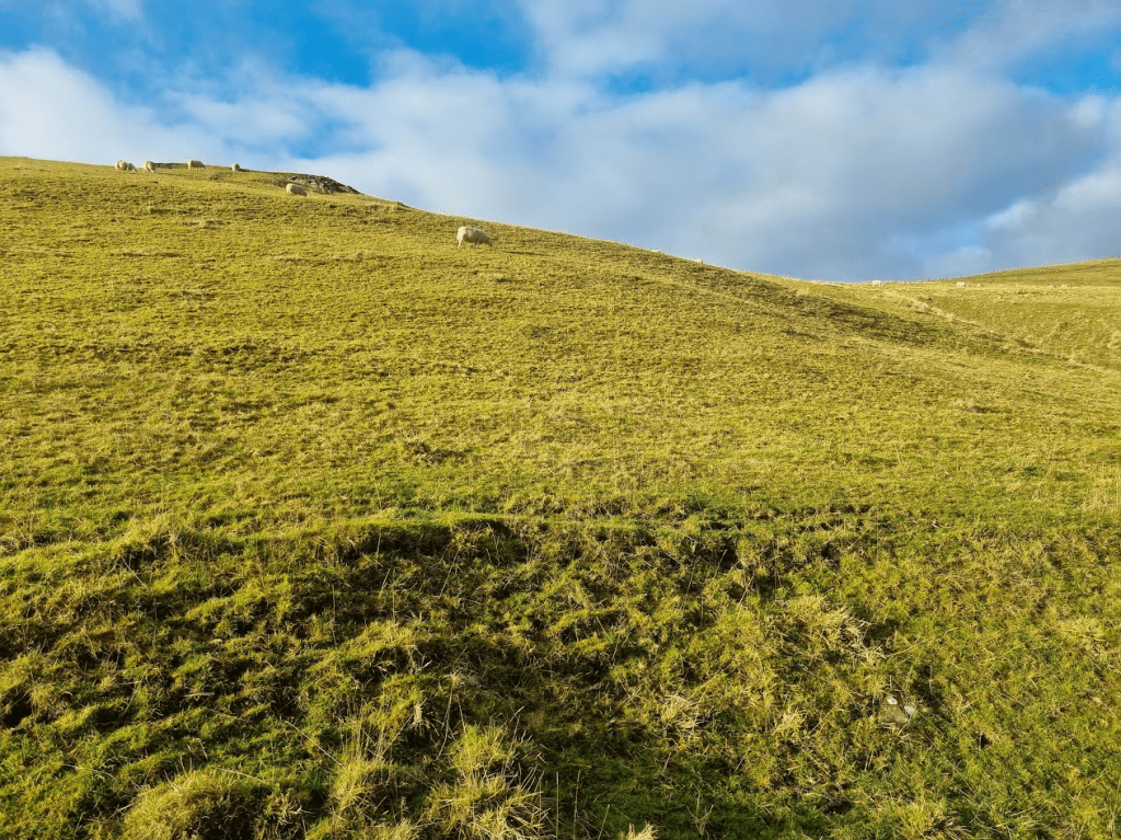 It fairly soon started to get light. Add to this the fact that the underfoot conditions were quite good at the start and it didn’t feel too much different to the March edition. Indeed as I came towards Shillmoor and saw the sheep on the hills and bright blue skies it was a lot like March – had all my worry and warm kit been for nothing?