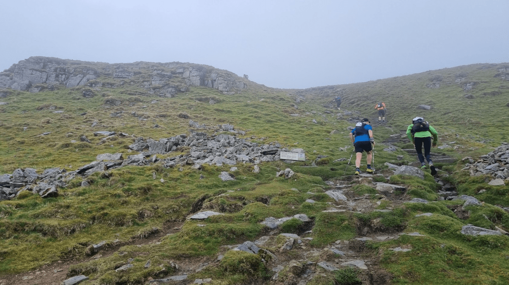 There was short welcome speech and a minutes silence for a long time Fellsman volunteer who had recently passed away and then it was time for the race to start. This was the first indication that the Fellsman is ‘different’. In every other race I’ve ever done, when the starter says ‘Go!’ everyone runs in roughly the same direction – if they don’t they are going the wrong way. Some of the Fellsman route is mandated, much is obvious. The rest – as I was soon to find – mainly involves bogs. However as there is no mandated route off the starting field, people shot off in all directions. My fellow Sandbaggers headed straight for a high steep bank and scrambled up that so I followed them. Once outside the field I think pretty much everyone ended up on the same foot path towards Ingleborough, first peak and checkpoint of the event, also the second highest at 724m.