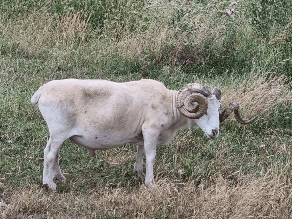 I won’t go into too much detail about the day’s sweeping as this blog is already quite long. I do have to mention Sheep Moats – which was the name we gave to the ditch between the sea wall and areas of sheep grazing, and there was this fine fellow, who was noticed by several runners – but then he was hard to miss.