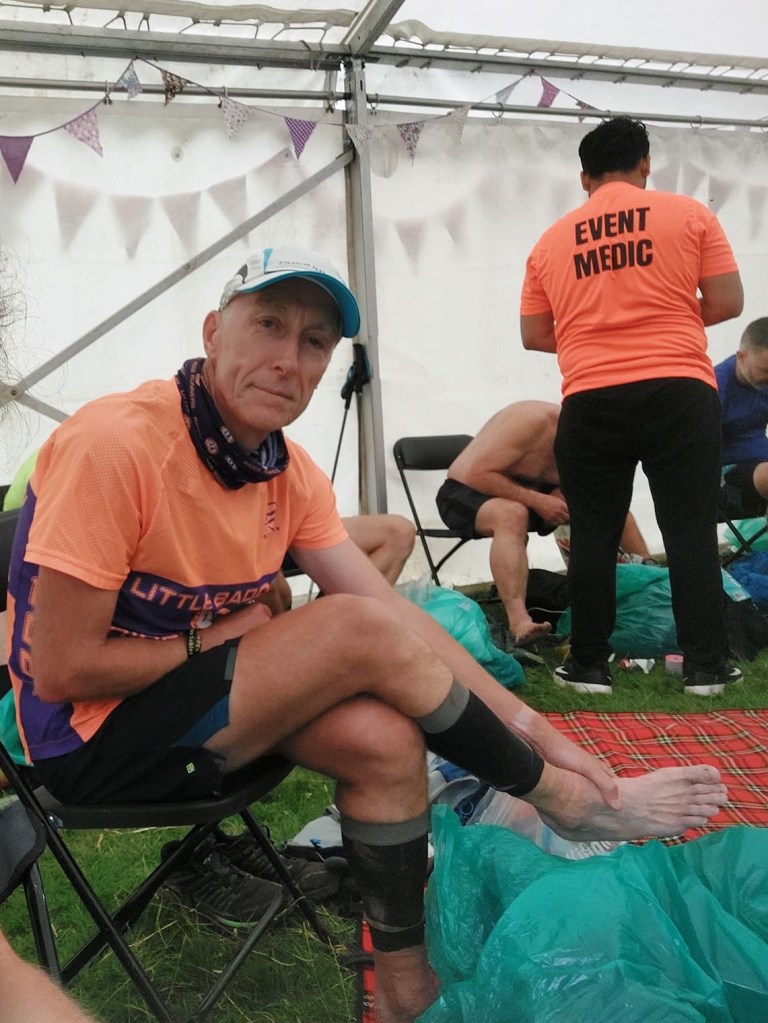 The first thing was to get my socks off. Too my surprise my feet were pretty much intact – Trenchfoot Cream seems to be good stuff! I did have a different pair of shoes to change into – Inov8 G280, a more cushioned shoe – but I felt that as I’d got no blisters so far it would be foolish to change an apparently winning combination so I let my feet air, gave them a liberal coating of Trenchfoot Cream and clean socks, and put the Roclites back on. A lovely marshal got me some pasta and a coffee and I changed my torch battery and recharged my watch.