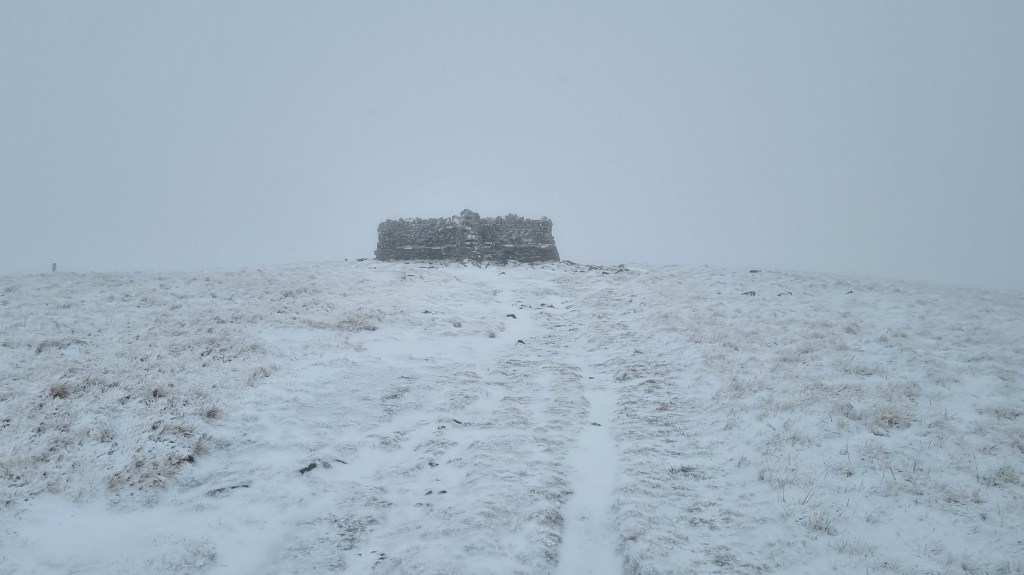Great Shunner Fell represented my first proper encounter with snow and ice. There had been a little the day before but this was proper ‘winter wonderland’ stuff. The way up was fairly straightforward if a bit slippery. I tried walking on some of the ice with my Yaktrax and wasn’t filled with confidence. I had used them briefly on my December recce and they had provided more grip but the ice here seemed too hard to gain any purchase on. It may have been that he coils were between the studs on my shoes and so not getting a good grip, or I wasn’t heavy enough to cut the ice or just that the ice was too hard but anyway I tried to avoid the icy bits, probably a good idea regardless of the expected level of traction if I think about it.