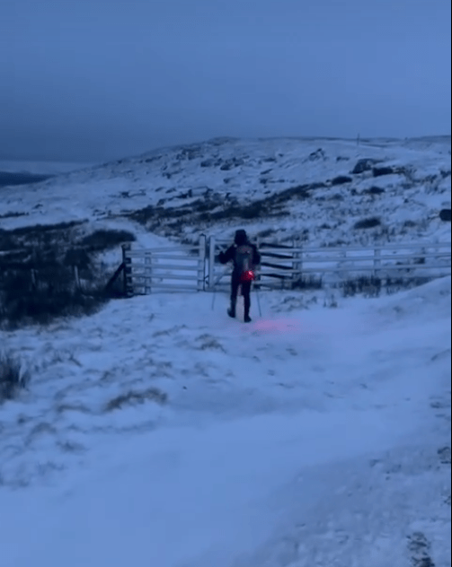 I reached Hardraw and the site of the Summer Spine checkpoint at the start of the track to Great Shunner Fell. It was on this track I stopped and put on my Yaktrax – a set of metal coils on a rubber ‘frame’ that went over my shoe to provide more grip on ice. It took a while to fit them, I had practiced at home but after 110 miles of the Pennine Way and dressed in cold weather gear my body didn’t bend quite as well as it had sitting indoors at home when I practiced.