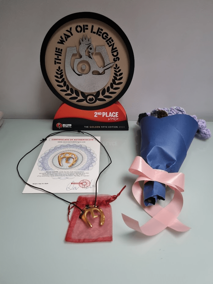 It is made by a very talented local artist called Oscar Martin de Burgos. It’s called the Fenix and is solid silver. For the Golden Edition of the Way of Legends it was plated with gold. This made me very happy as I have a silver and a gold version. I was very honoured to receive mine from it’s creator.