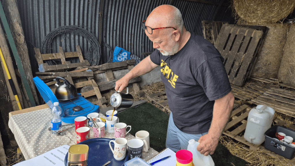 As we approached the stile I remembered the couple fondly and noticed that this time we would have to climb it as the gate was closed. I wasn’t quite prepared for what we found the other side of the wall though. On our way across the fields we had seen a sign. I assumed it would be asking Spiners not to sleep in the nearby derelict barn but instead it was a sign for ‘The Nettlepot Café’, something I was entirely unfamiliar with but sounded possibly interesting – so interesting I almost immediately forgot about it. I was quickly reminded about it though when it turned out that the lovely couple from Winter 2024 had significantly upped their game and turned the hut by the side of the road into an entirely free pop-up stop for Spine racers!