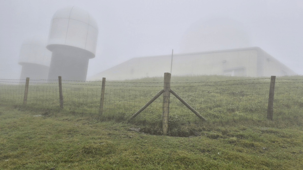 As we ascended the weather got worse. We had put our waterproof trousers on at Dufton and this seemed to have been the right call. Usually you get a view of the giant ‘golf ball’ on Great Dun Fell on the way up but not this time. I had seen signs warning of construction traffic on the road to the radar station but when I couldn’t see the ‘golf ball’ I assumed it must have been dismantled – hence the signs. I was so convinced I took a picture of the base of the structure. It was only much later when I was going through my photos I saw that the ball was just faintly visible but the rain and mist had completely obscured it from view to the naked eye!