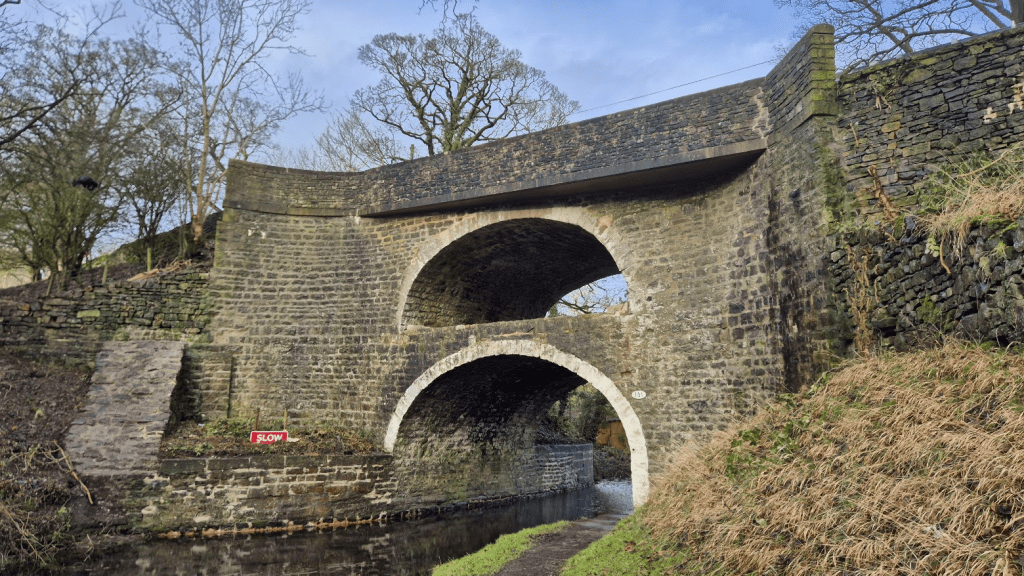 From the Cam End Tuckshop to Gargrave is a fairly unusual section of the Pennine Way in that it is fairly flat. For about three quarters of a mile it follows the Leeds and Liverpool Canal and passed through the double arch bridge at East Marton. Historic England suggests that an original packhorse bridge was built in circa 1790 by Robert Whitworth, engineer and the second arch added to make the passage of traffic over it easier. My only issue with that explanation is that the whole bridge appears to be of a similar age, and I’m not sure how it made the passage of traffic easier, unless there was a drop down to the original bridge. My theory would be that the bridge needs to be that high to align with the road, and that the builders simply built two bridges of a style they were comfortable with, one on top of the other. If they had filled in the top arch it would place a lot of stress on the lower bridge, and one high arch would require engineering and building techniques they may not be familiar with.