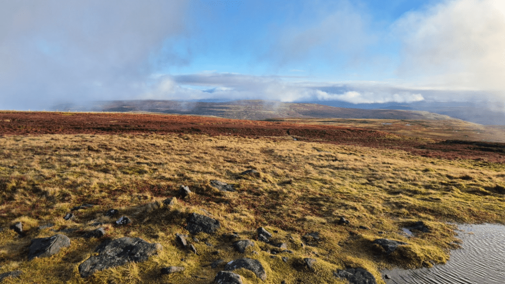 After the trek to Hardraw it was time for the day’s big climb, Great Shunner Fell. This was where things should get more familiar, as I was on this part of the route in Summer for the Spine Challenger North with Sharon. Great Shunner Fell is quite a long climb, almost 5 miles from the road turn-off past the Green Dragon to the top, but I quite like it. I make quite big thing of parts of the Pennine Way I don’t like (the Cam High Road) so I feel I should highlight those that I do. There is nothing terribly special about Great Shunner Fell but the views aren’t bad, it was daylight and the weather slowly improved as I got further up the fell. By the time I got to the top, the cloud had lifted a bit, the sun was almost out and the colours were lovely.