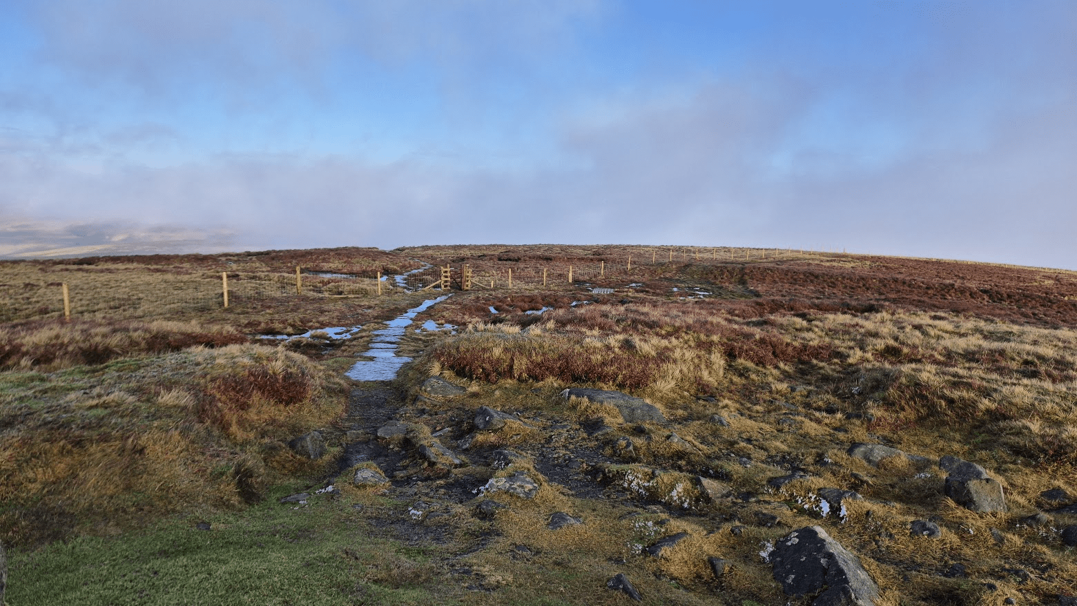 I’ve been across Sleightholme Moor enough times now to know not to be taken in by the first quarter of a mile of so, it was quite dry and easy going as it often is but it soon gave way to the boggier, trickier terrain I was expecting. The large hole I’d passed in Summer was still marked so I made sure to pass well to the right of the sign as instructed. It is quite important to stay on the path as there are a couple of bridges over some of the really wet bits. In places the path was churned up so much that I ended up walking alongside it through the vegetation but always keeping it close. After about three miles the path across the moor met up with Sleightholme Moor Road, I’d crossed the worst of the moor without incident.
