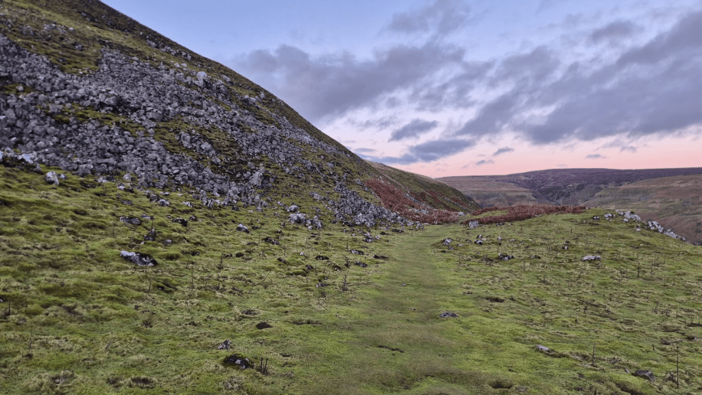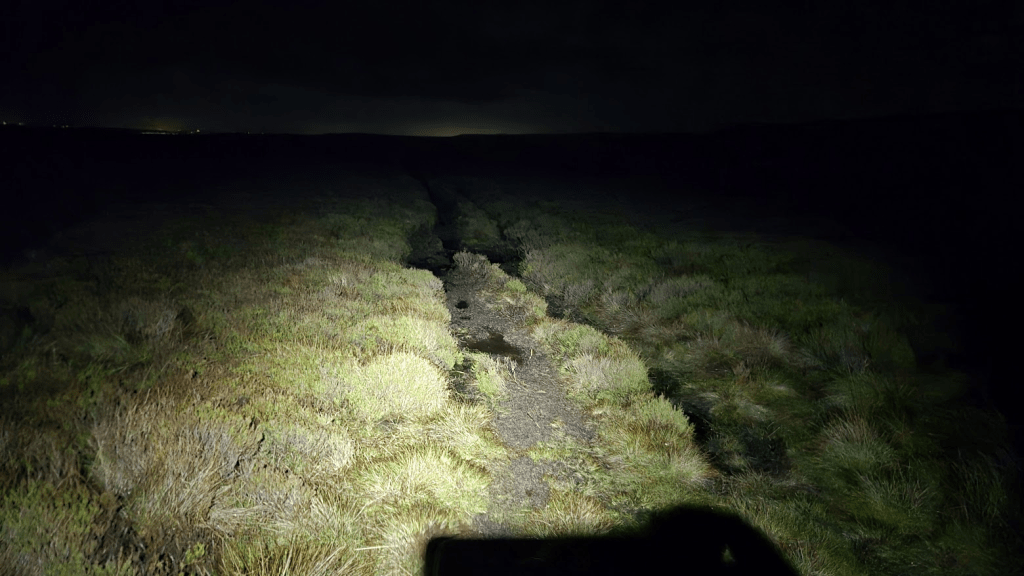 Cotherstone Moor always looks daunting in the daylight as it does undulate a bit, despite it only being about three and a half miles across. As it was dark it just looked like any other bit of moorland. Also as it was dark and below freezing it was starting to firm up a bit as it froze. Not enough to be completely straightforward – a shoe full of very cold water was still a hazard for the unfortunately placed foot – but better than if it had been completely soft.